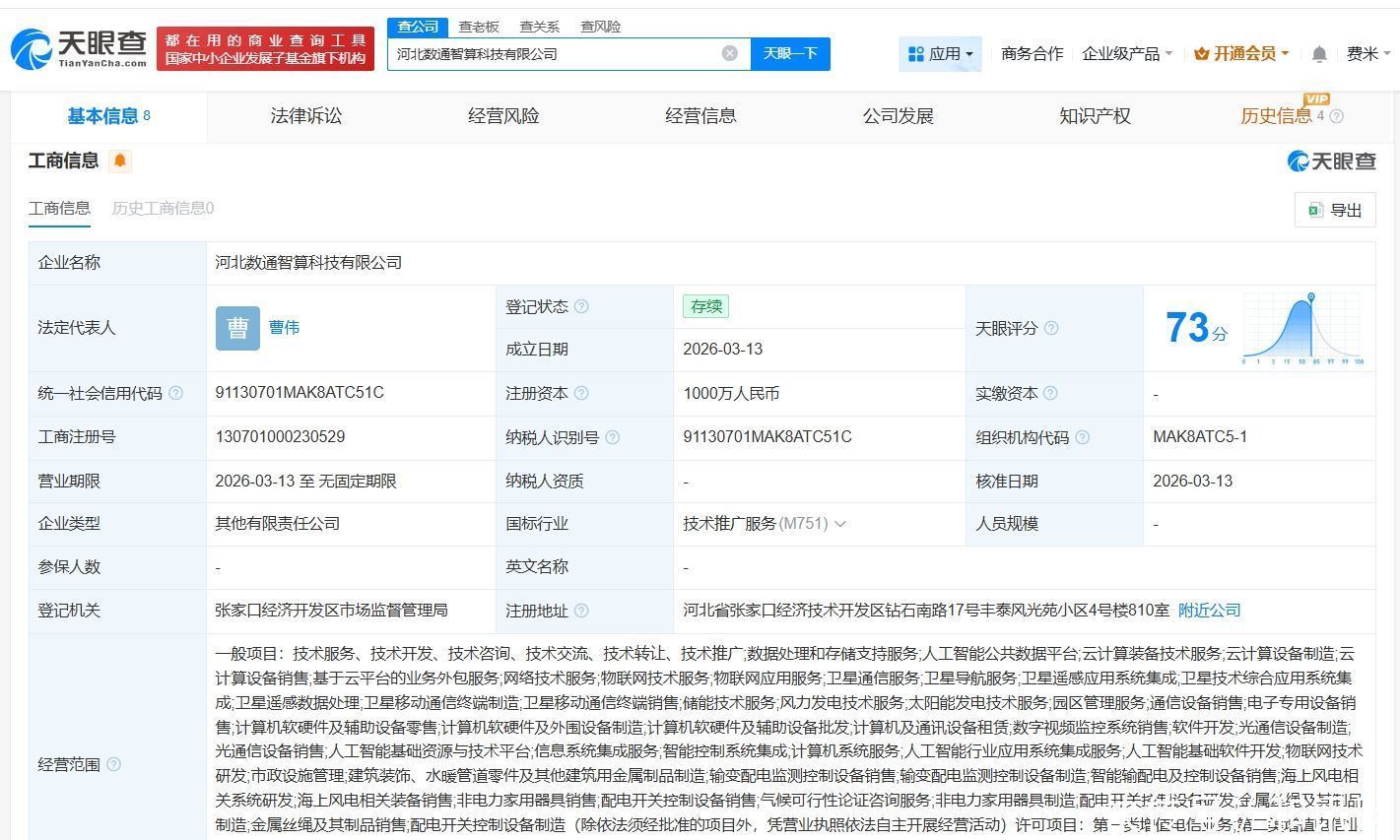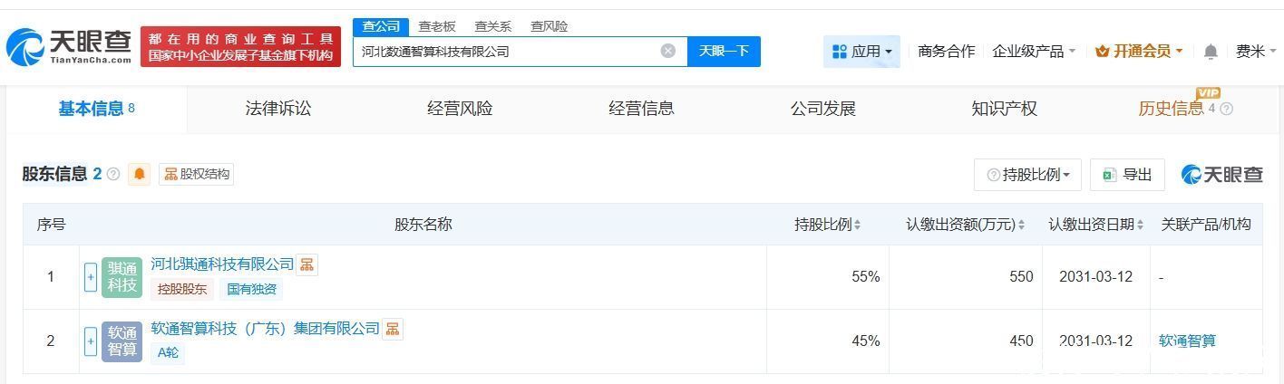 天眼查App显示,近日,河北数通智算科技有限公司成立,法定代表人为曹伟,注册资本1000万人民币,经营范围包括数据处理和存储支持服务、人工智能公共数据平台、云计算装备技术服务等。股东信息显示,该公司由河北骐通科技有限公司、软通动力(301236)旗下软通智算科技(广东)集团有限公司共同持股。